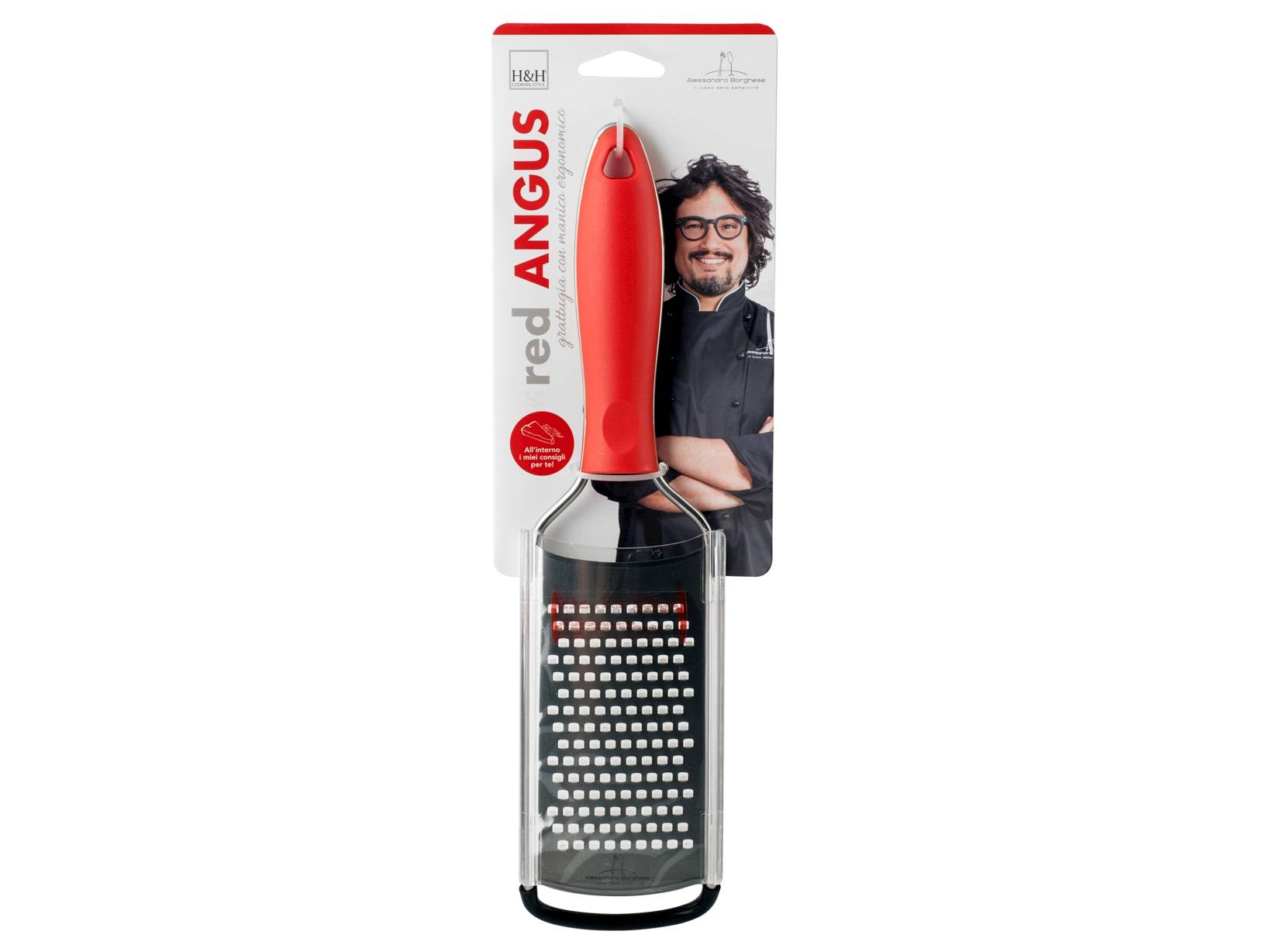 Grattugia red angus con lame in acciaio inox che permettono di grattugiare con facilità formaggi a pasta dura, verdure, frutta secca e cioccolato. L'impugnatura e il piedino in materiale antiscivolo garantiscono stabilità durante l'utilizzo. In ogni prodotto della linea trovi le "kitchen tips" di chef Alessandro Borghese: ricette, consigli, segreti. E tanti disegni da conservare e collezionare. Dimensioni 7,5 x h 31 cm. LINEA BORGHESE GADGET,OUTLET,SCONTO40,H&H,heh