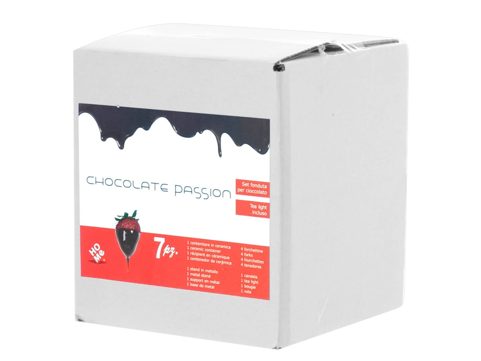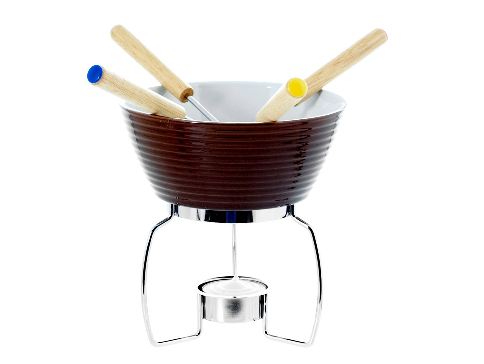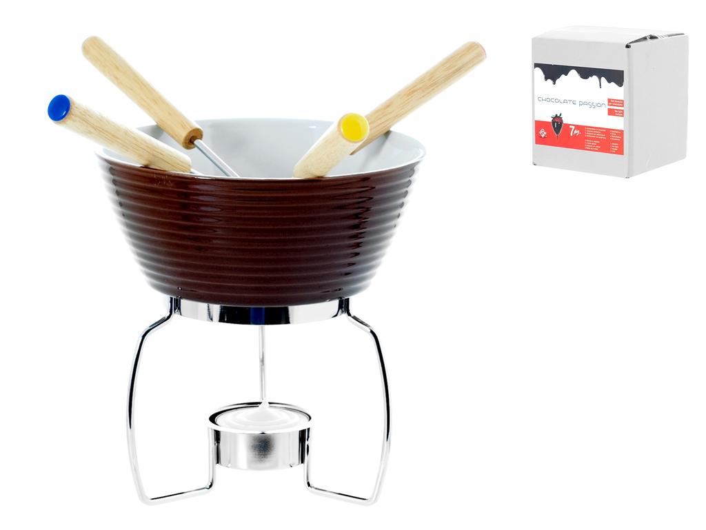 Servizio fonduta per cioccolato con 7 pezzi realizzato in stoneware marrone su un piedistallo in acciaio con 4 forchettine e candelina tealight compresa. LINEA CHOCOLATE PASSION