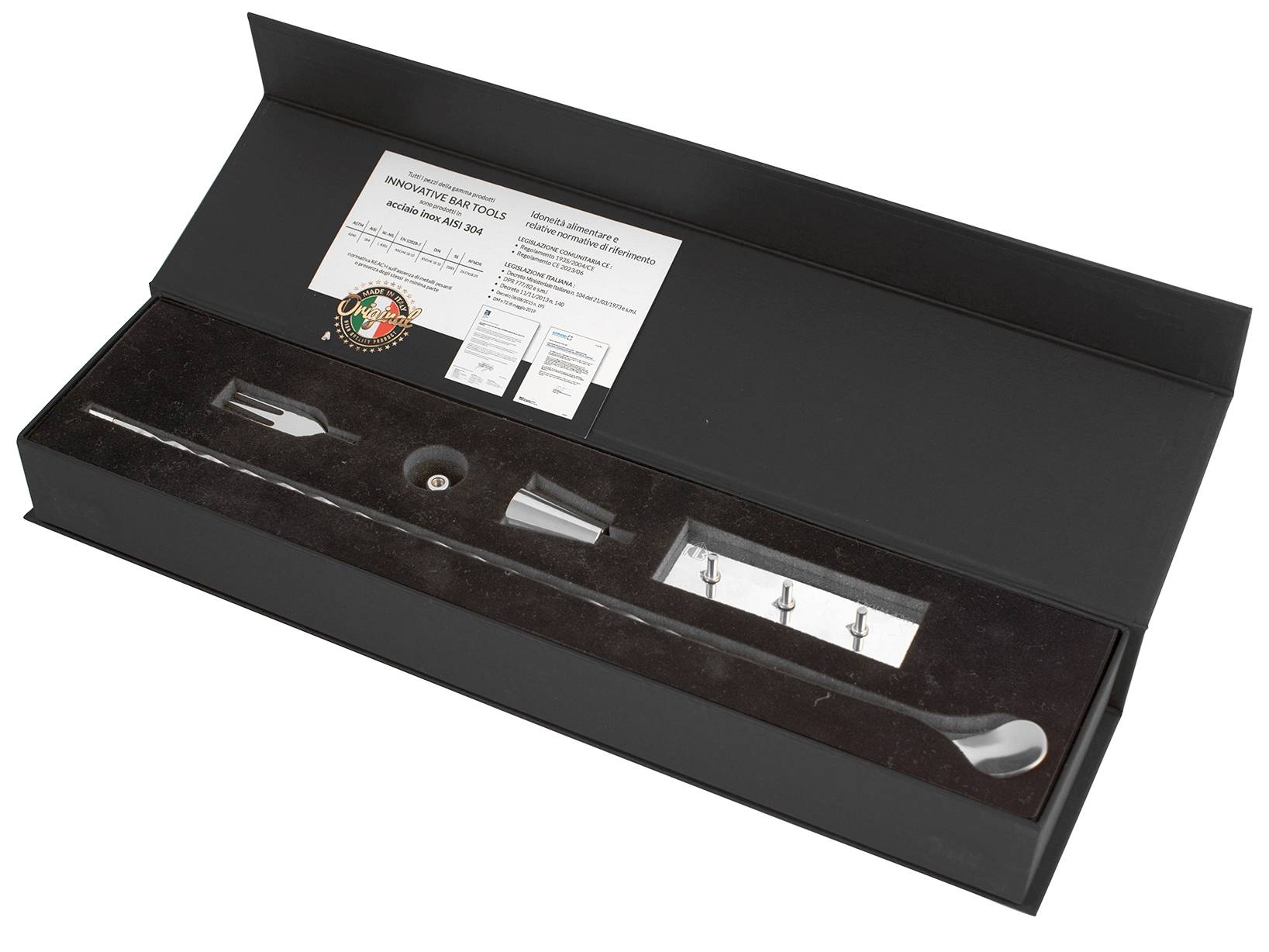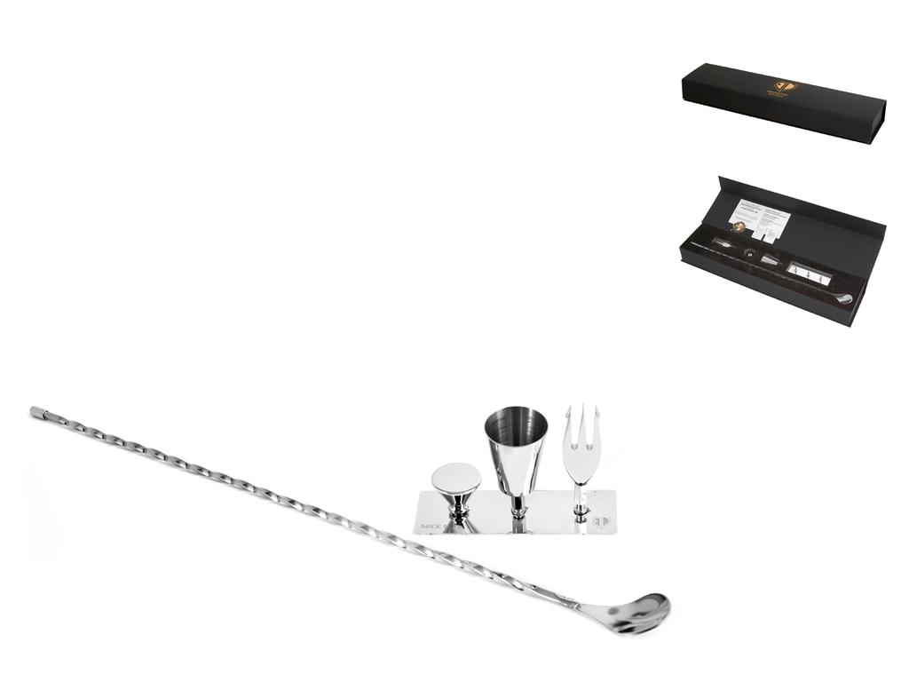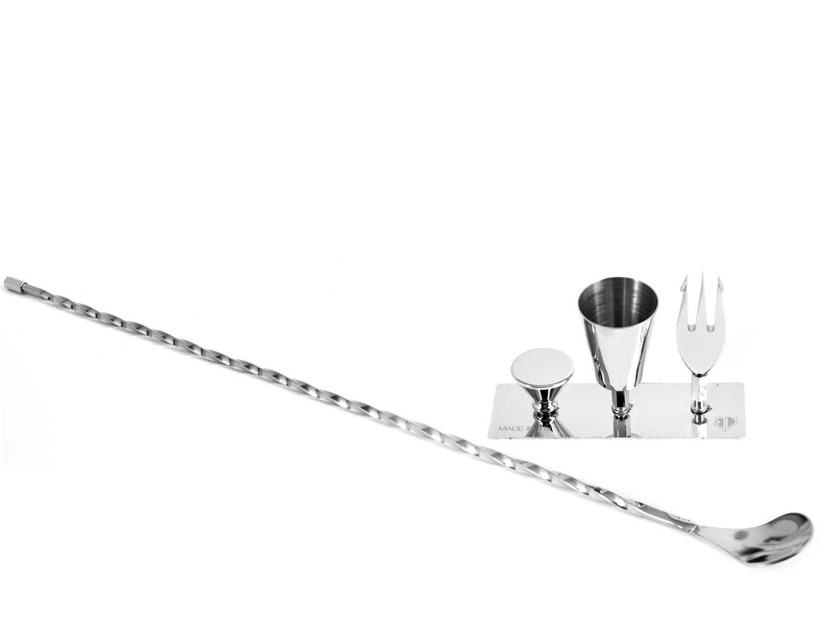 Set 4 pezzi main spoon in acciaio inox. Dimensioni: cm 2,70x41hx2,40 il set contiene una forchettina, un muddler ed un mini jigger, accompagnati da una piastrina porta tools. Professionalità, qualità superiore ed eleganza si uniscono per creare gli strumenti di questo set Made in Italy ed artigianale. LINEA BRUNO VANZAN,BRUNO VANZAN