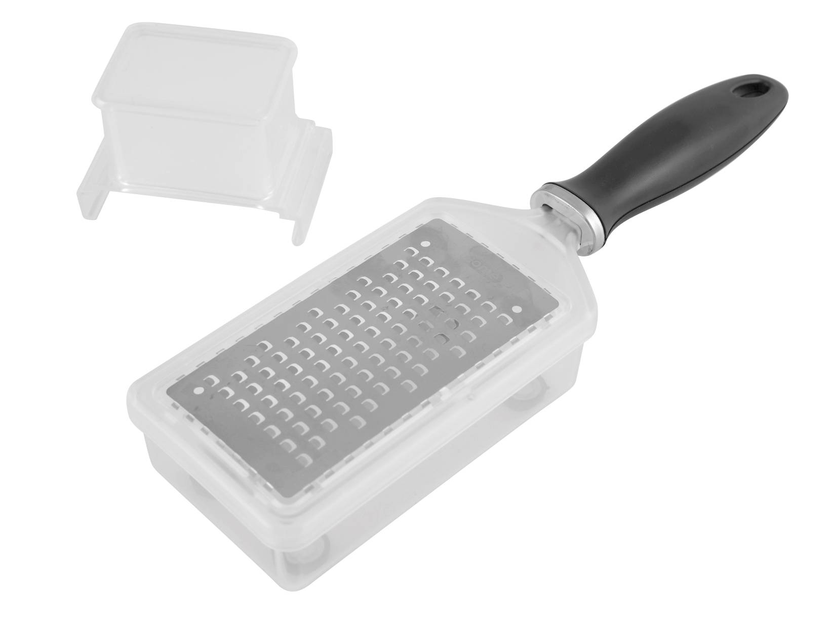 Grattugia con salvadita in acciaio inox con manico antiscivolo.
