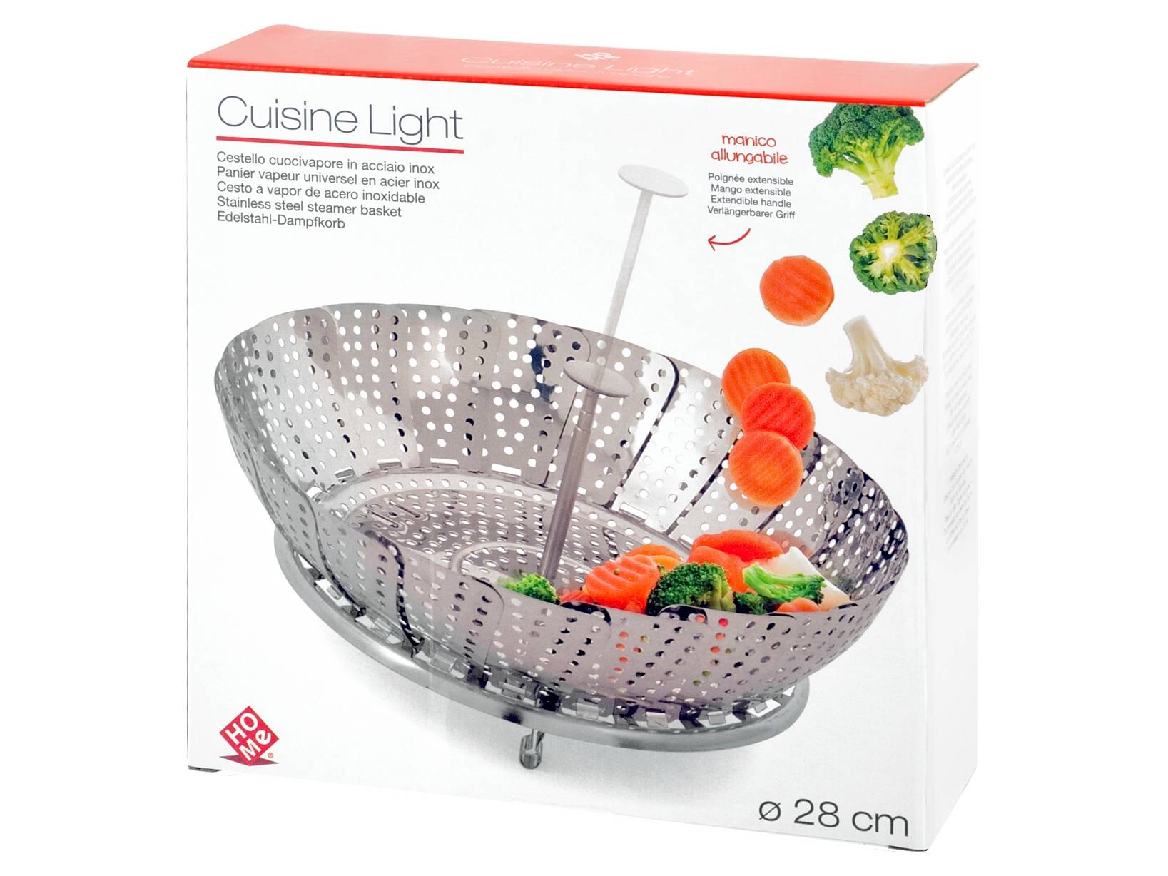 Cestello cuoci verdure cuisine light in acciaio inox cm 28 per cuocere al vapore. Utilizzabile nella maggior parte delle pentole da 2-5 litri circa. Asciugare bene dopo il lavaggio. LINEA CUISINE LIGHT