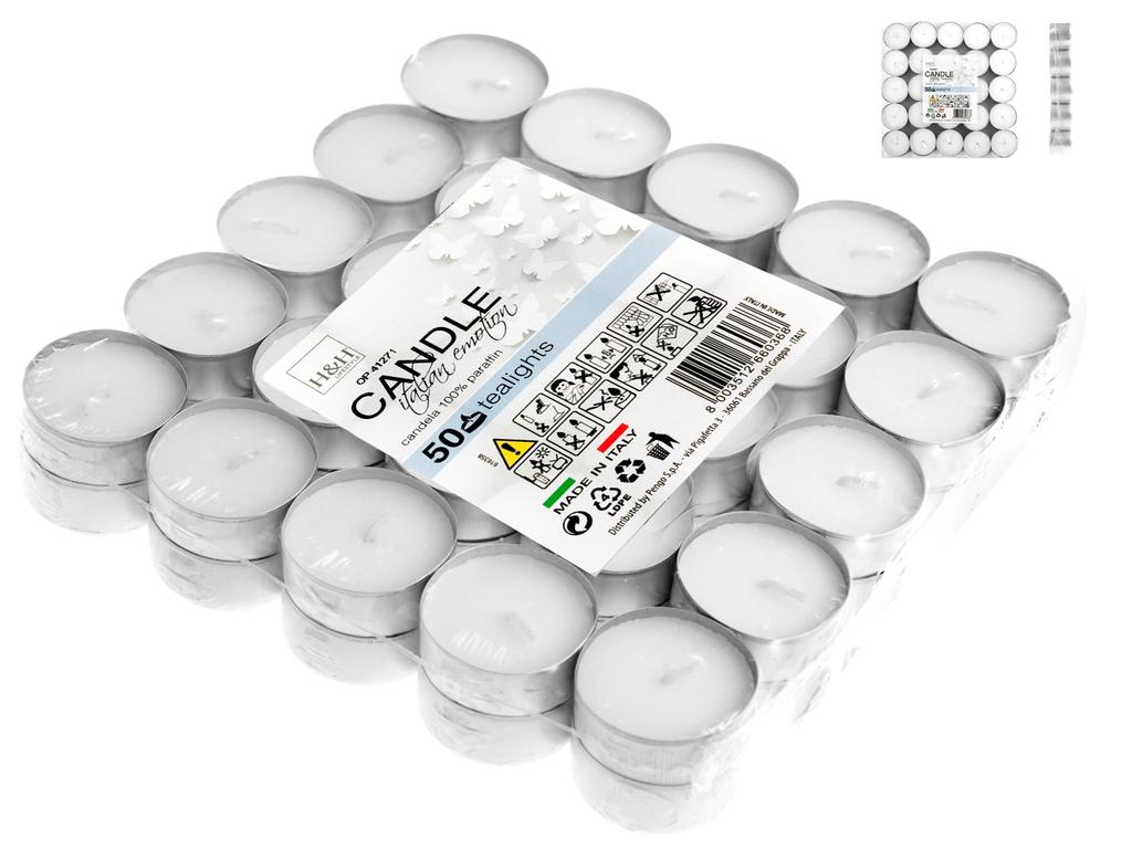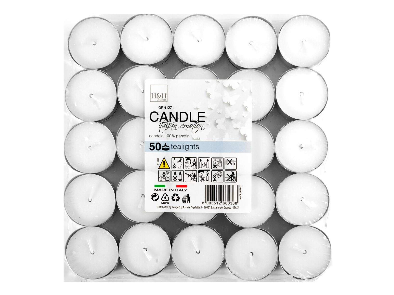 Confezione da 50 tealights, piccoli lumini in paraffina bianca con protezione in alluminio. Ideali per moltissimi utilizzi: da posizionare nel brucia essenze oppure in colorati e decorativi porta lumini. LINEA CANDLE EMOTION,H&H,heh