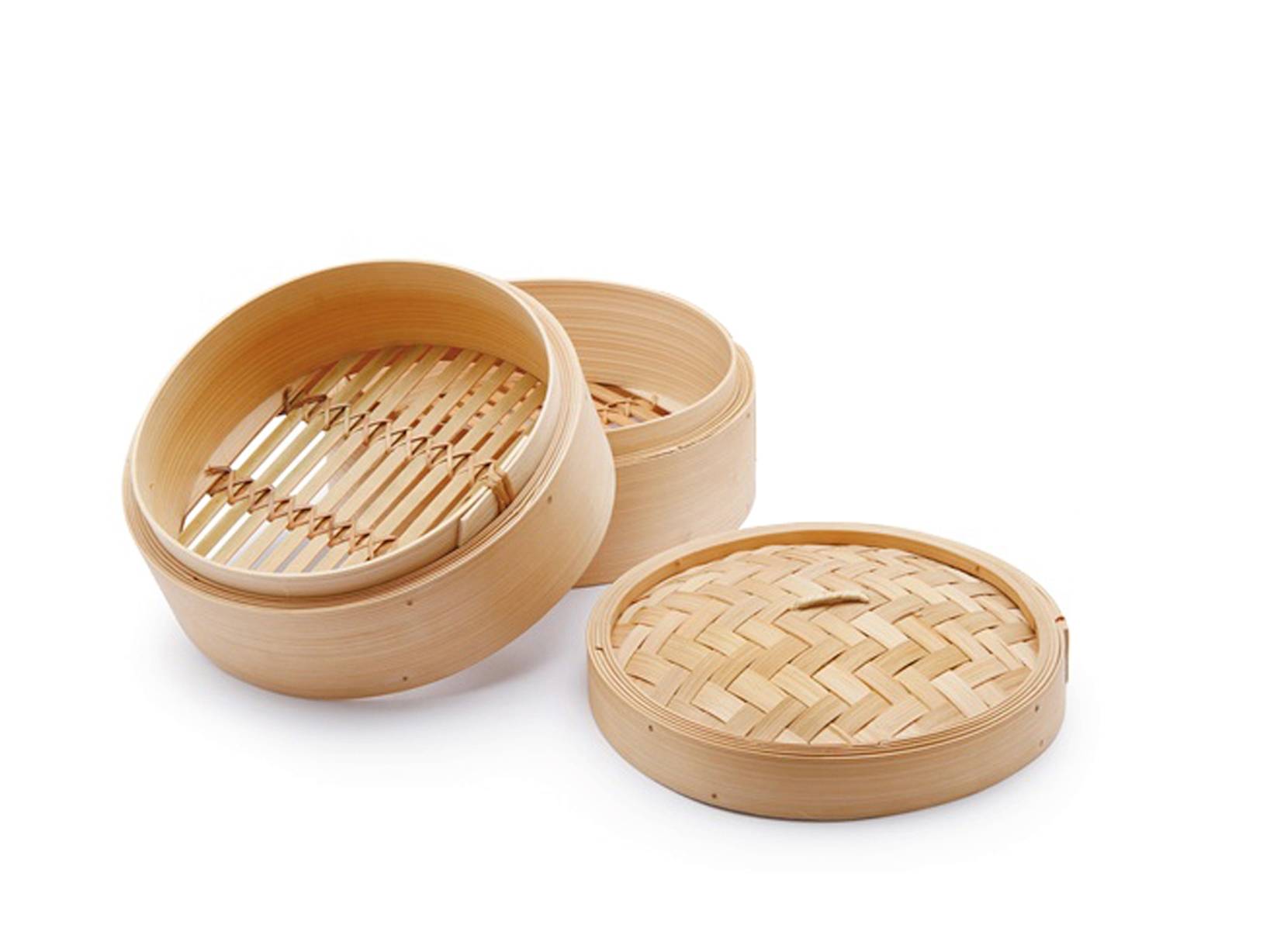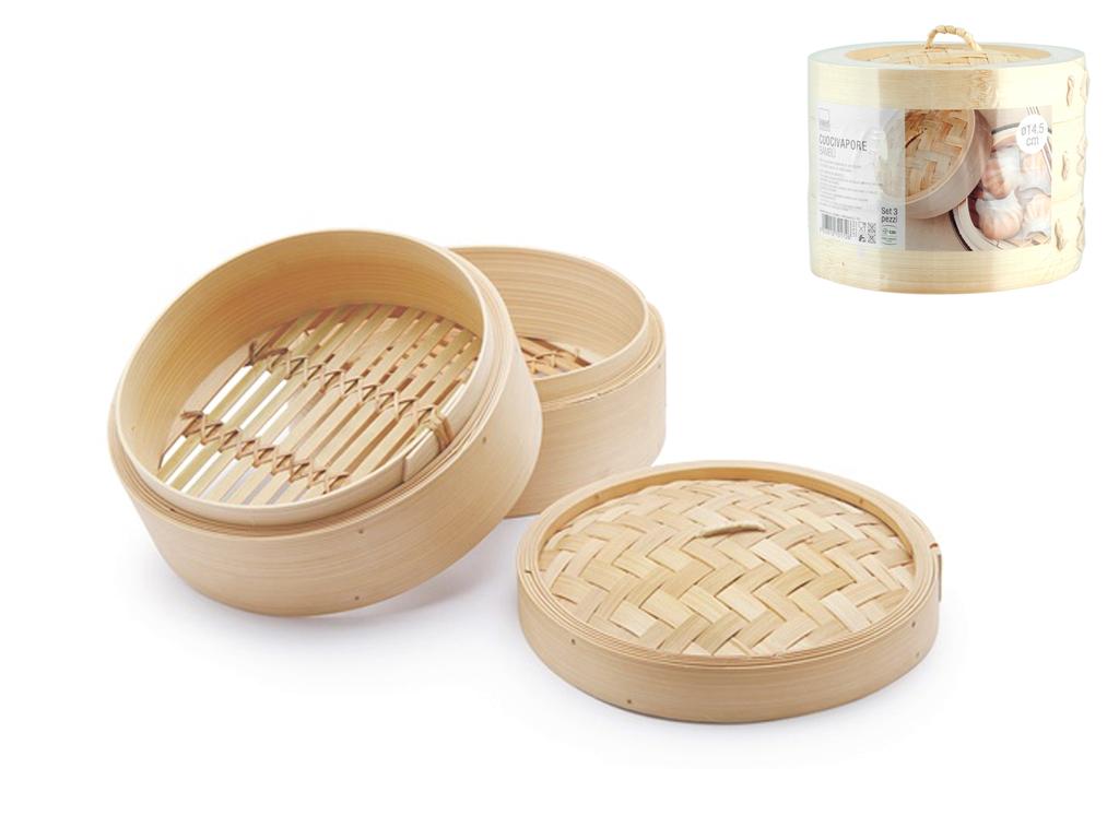 Cestello 2 livelli orientale cottura vapore in bamboo cm14,5. Va posto sopra una pentola o un tegame con acqua senza arrivare a toccare il fondo del cestello, il vapore si propagherà attraverso i piani portando a cottura i cibi. Si consiglia di porre sul fondo dei piani una foglia di lattuga o cavolo o carta oleata per non mettere a contatto diretto il cibo con il legno, evitando così che quest'ultimo assorba l'odore. Consigliato per la cottura di carni bianche, pesce, verdure e ravioli. H&H,heh