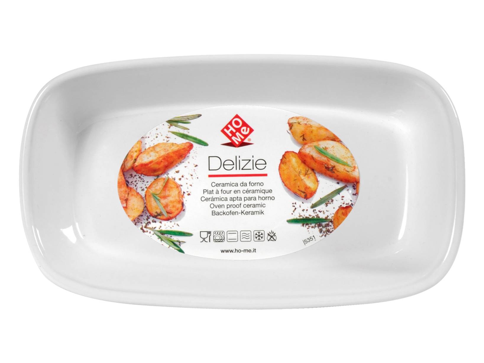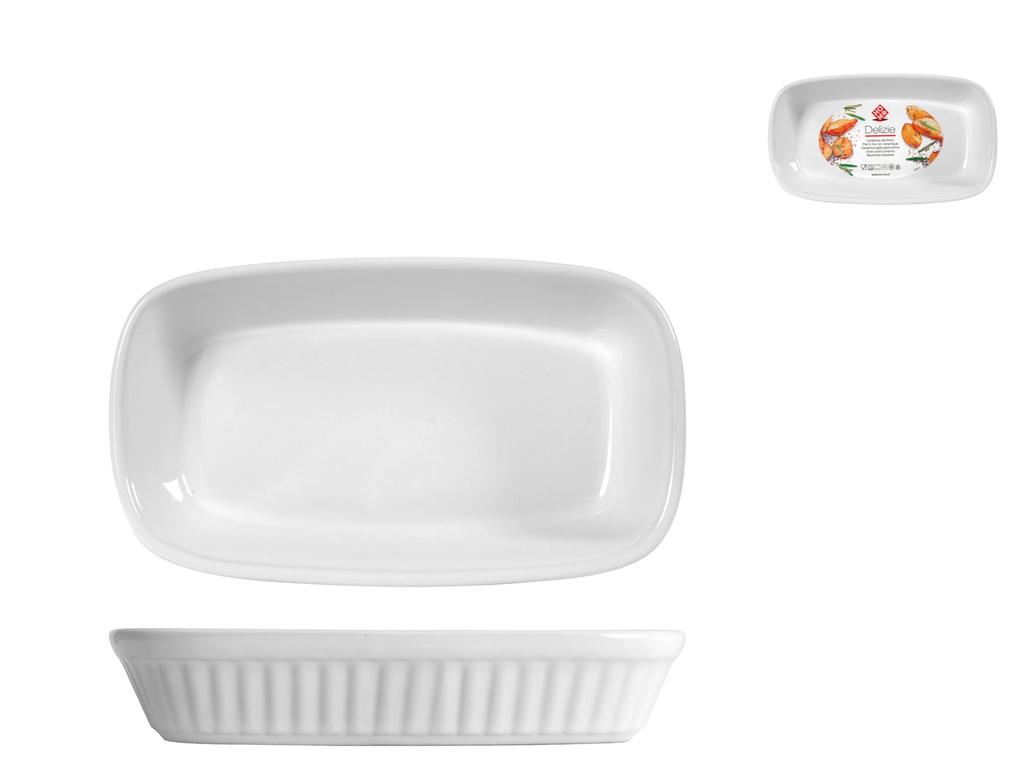 Elegante pirofila rettangolare in ceramica bianca, perfetta per cucinare piccole porzioni di lasagne, gratinati o dolci al forno. Con dimensioni di 18,5x11 cm e un'altezza di 4 cm, è ideale per preparazioni singole o contorni. LINEA DELIZIE,DELIZIE