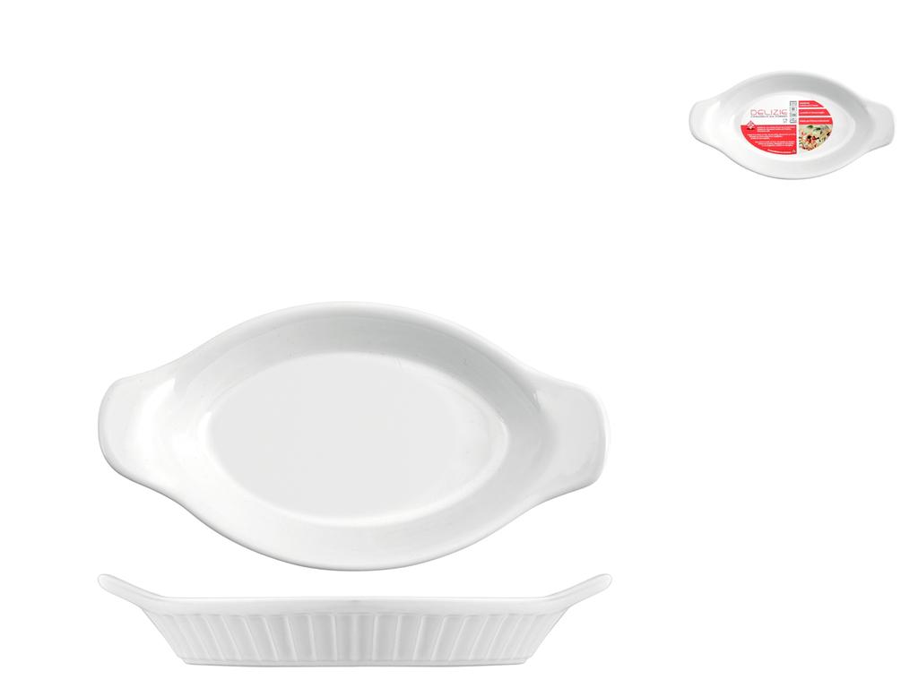 Pirofila ovale in ceramica bianca con manici, perfetta per preparare e servire piatti al forno. Dimensioni: 23x13 cm, con un'altezza di 4 cm, e manici pratici per un facile trasporto. LINEA DELIZIE,DELIZIE