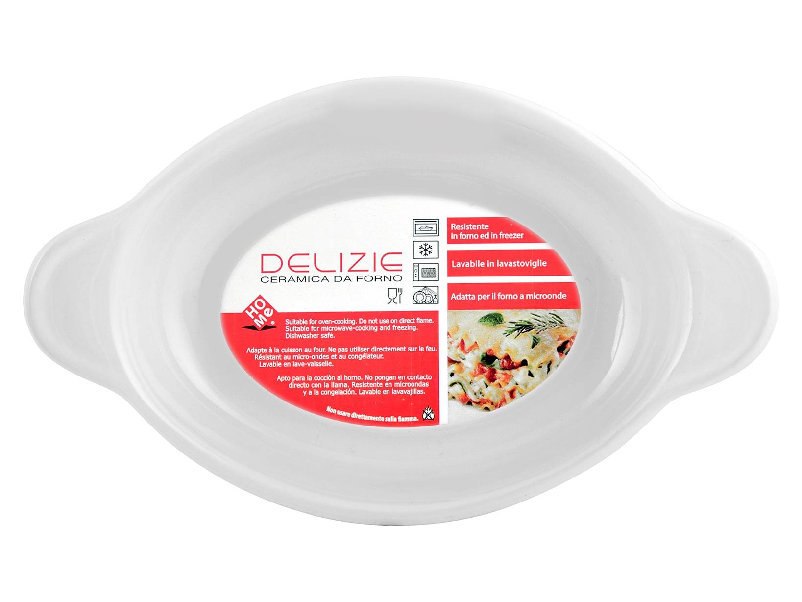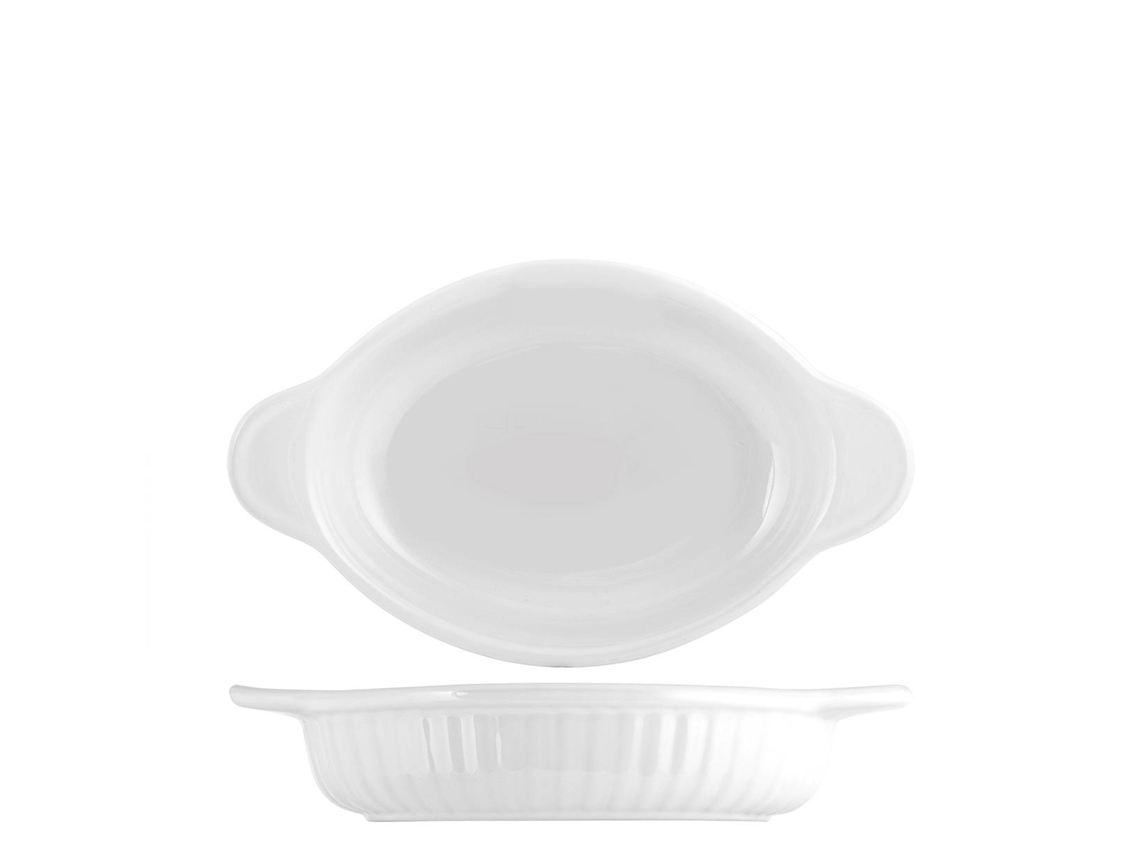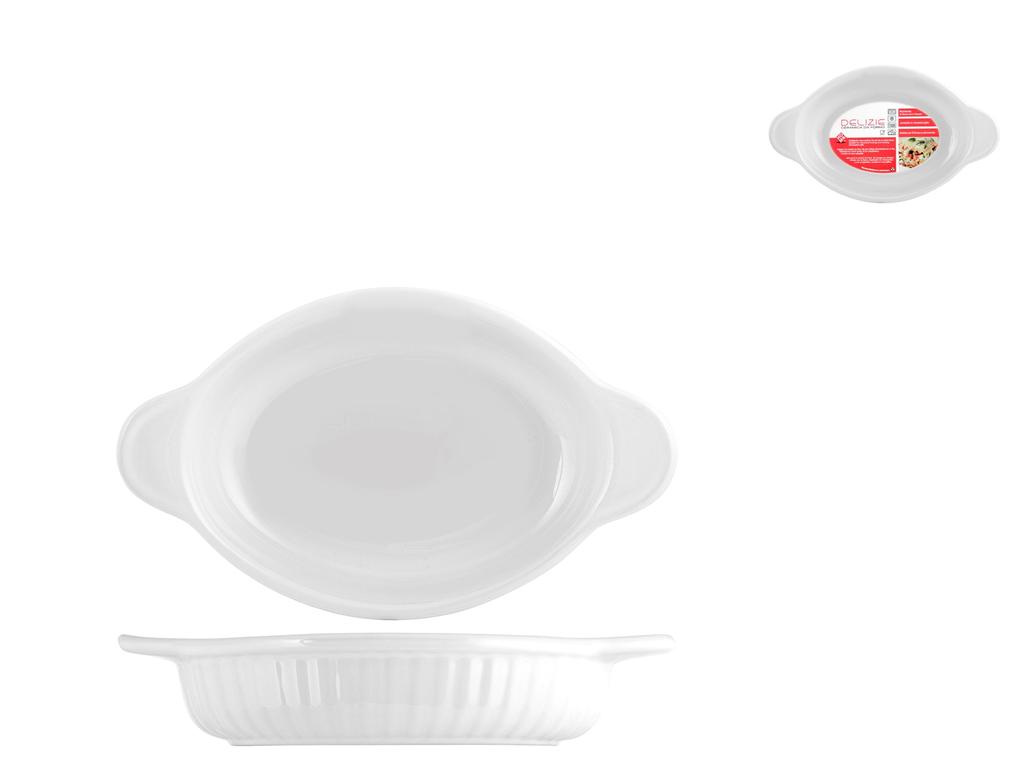 Pirofila ovale in ceramica bianca con manici, ideale per piatti al forno e preparazioni casalinghe. Dimensioni: 22x13 cm, con un'altezza di 5 cm e manici che facilitano il trasporto e la manipolazione. LINEA DELIZIE