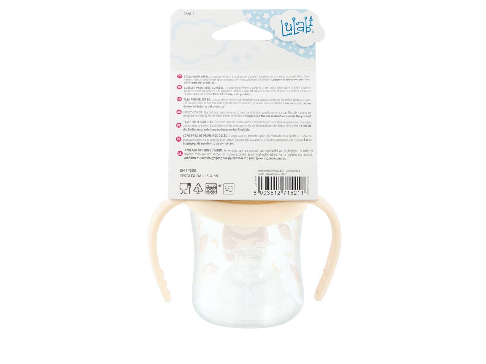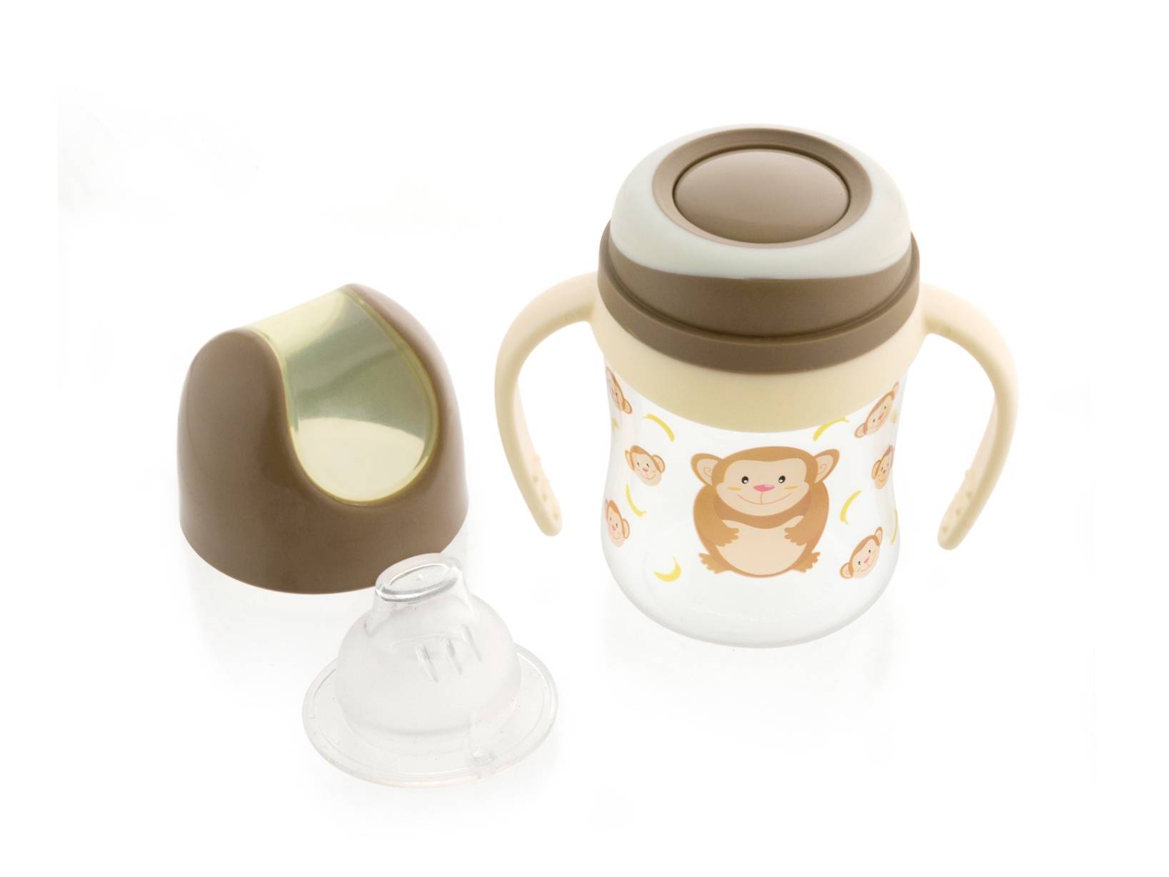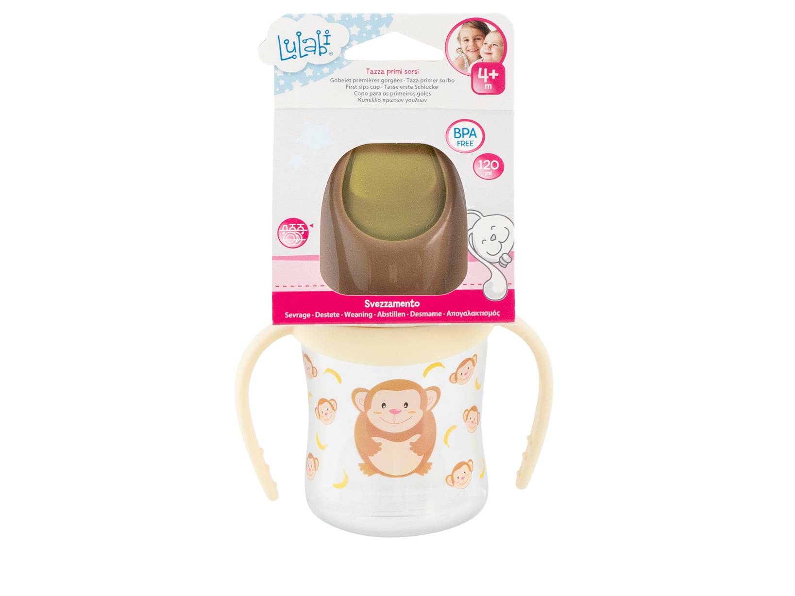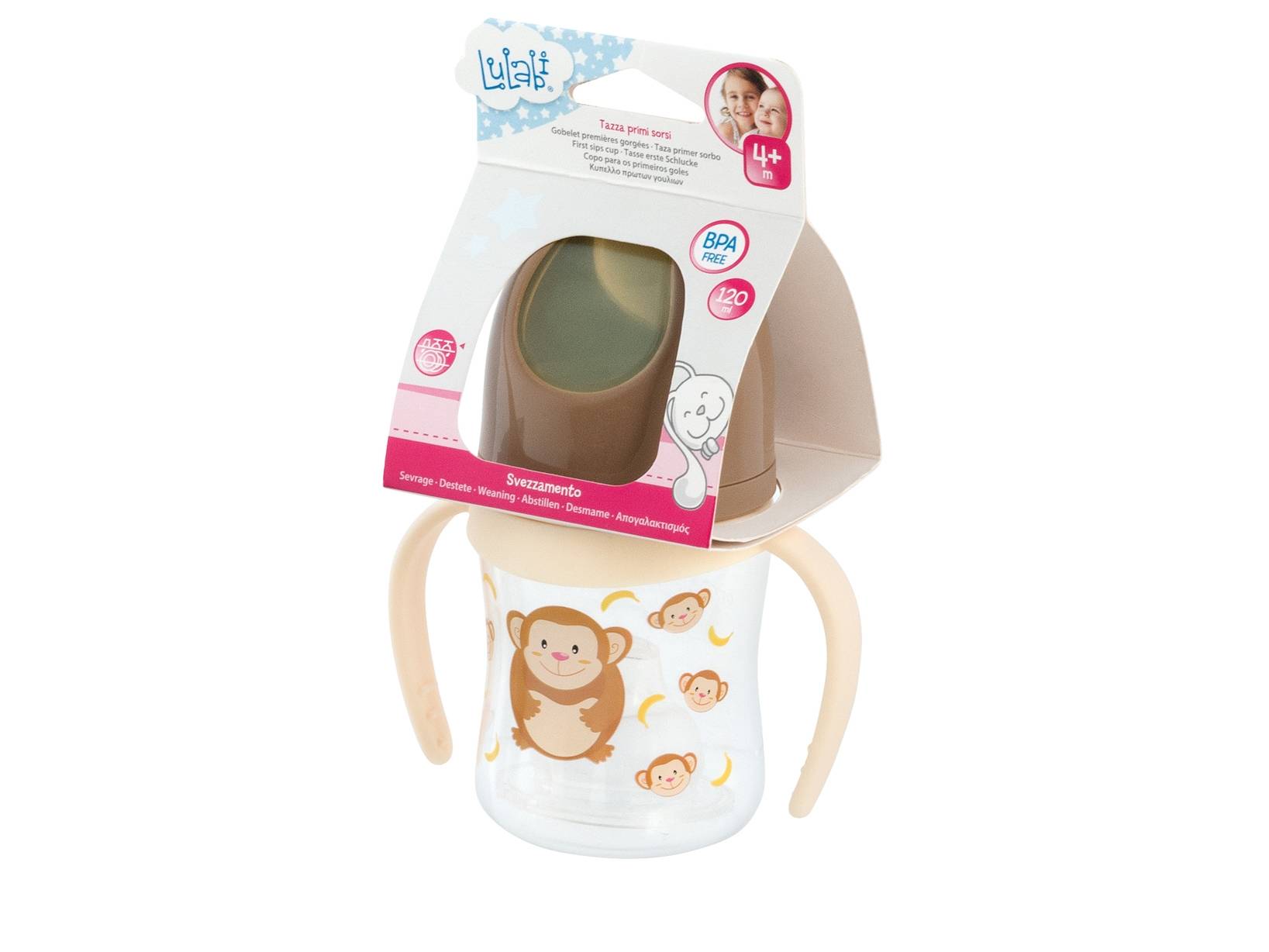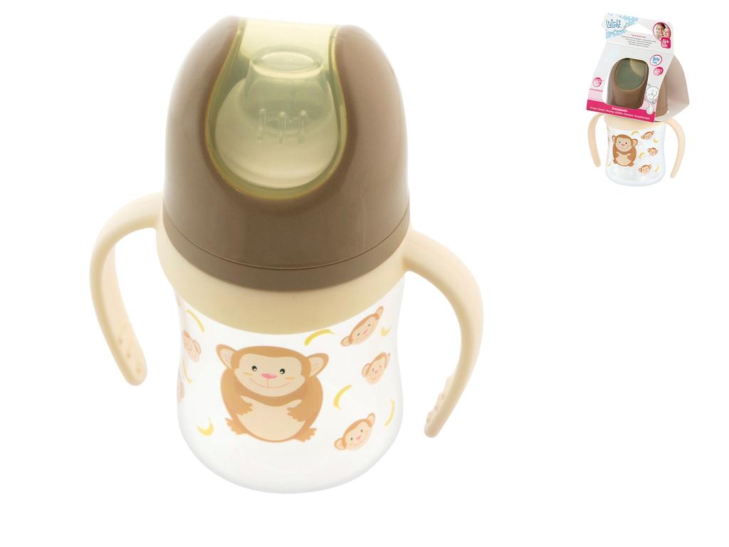 Tazza primi sorsi per i più piccoli realizzata in plastica e appositamente studiata per i primi sorsi del bimbo. Scopri tutta la collezione scimmietta: piatti, posate, set pappa, bicchieri e ciucci con colori brillanti e forme divertenti per aiutare il tuo bimbo a prendere familiarità con il cibo, rendendo il tempo dedicato al pasto un momento gioioso e divertente. LINEA LULABI,Lulabi