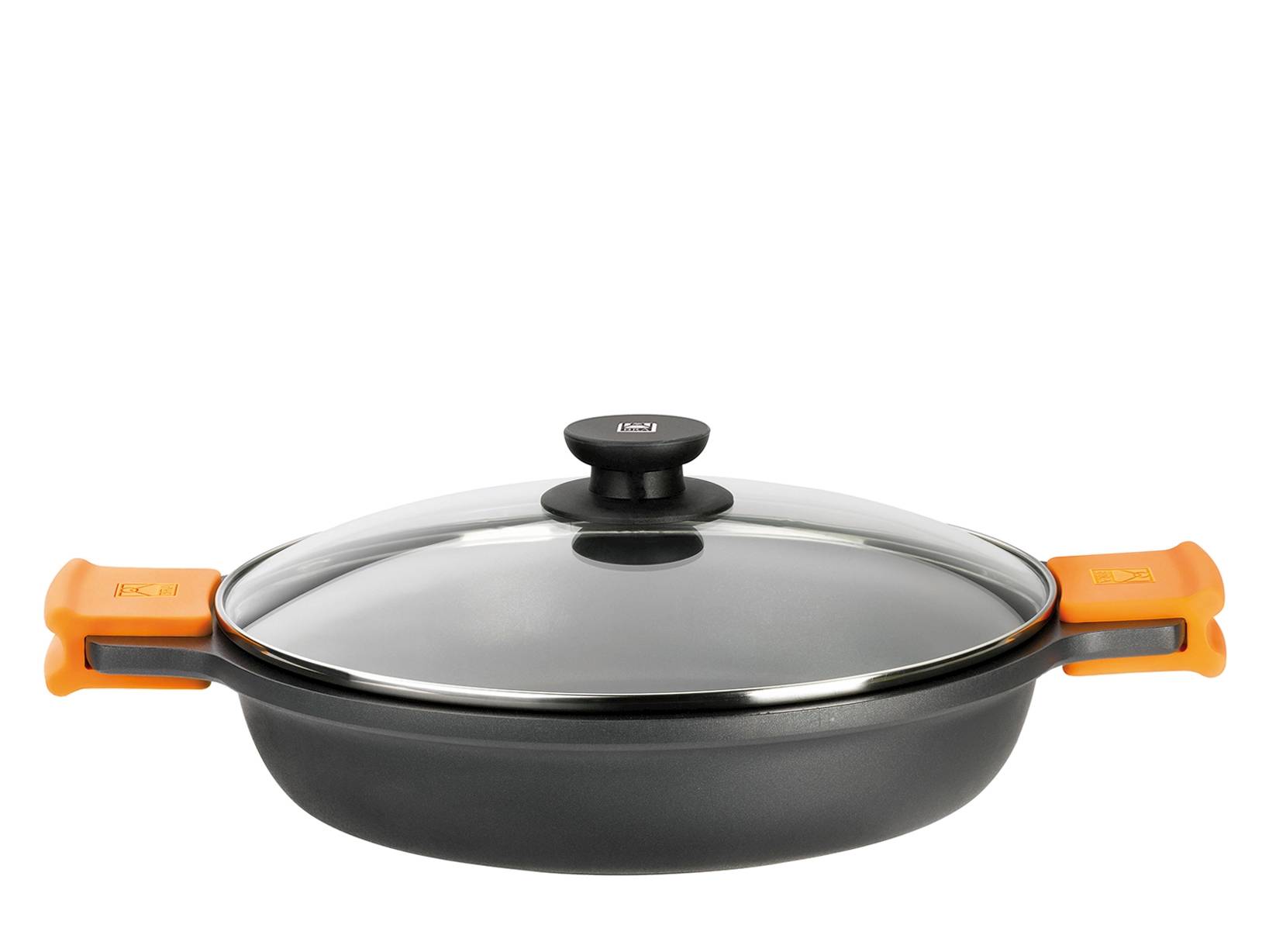 Tegame Efficient in alluminio pressofuso con rivestimento antiaderente con coperchio in vetro e 2 manici con copri maniglia in silicone cm 30. LINEA EFFICIENT,SCONTO25
