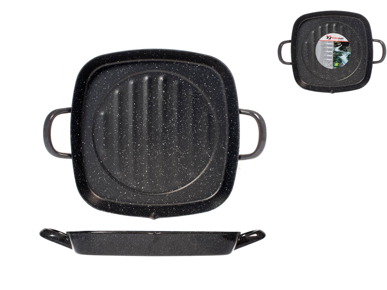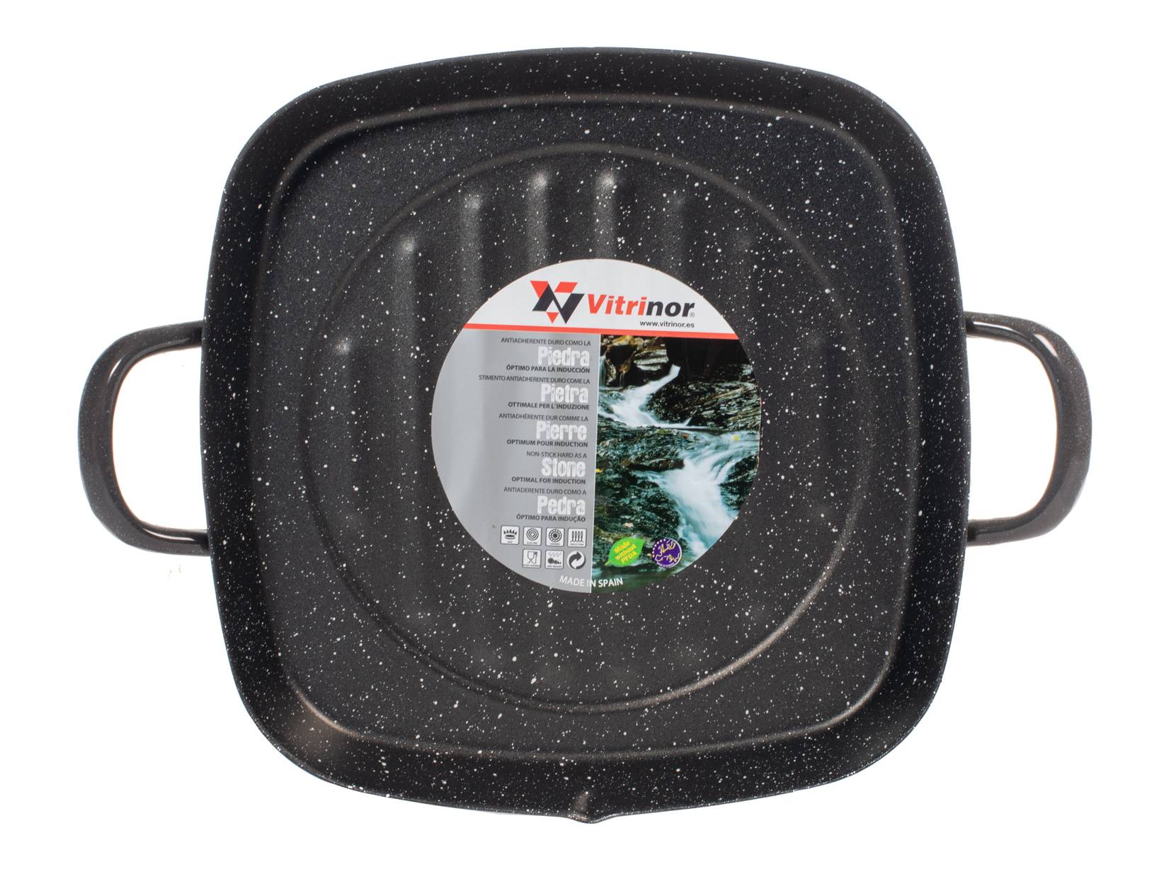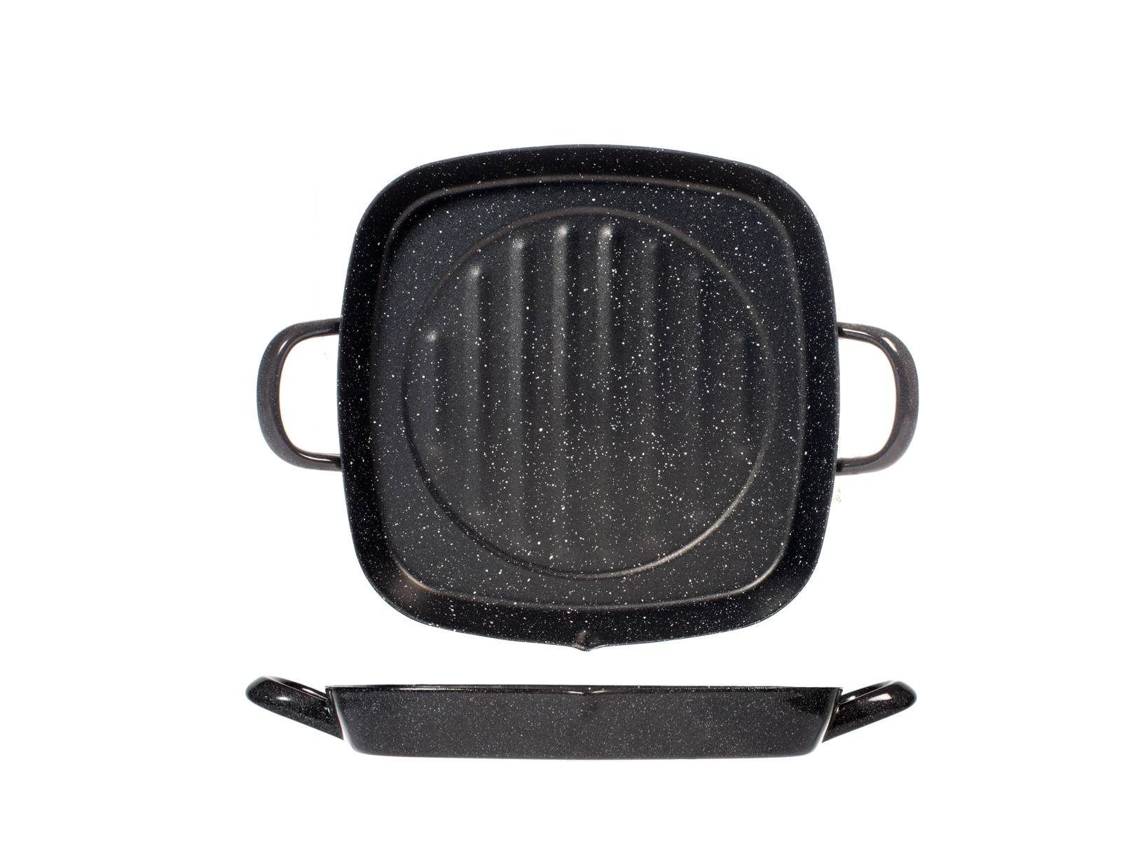 Bistecchiera da 28x28 cm in acciaio ferroso con rivestimento ceramico esterno e antiaderente interno privo di PFOA. Perfetta per cuocere carne e pesce, adatta a tutti i piani cottura, inclusa l'induzione. LINEA MACULATO