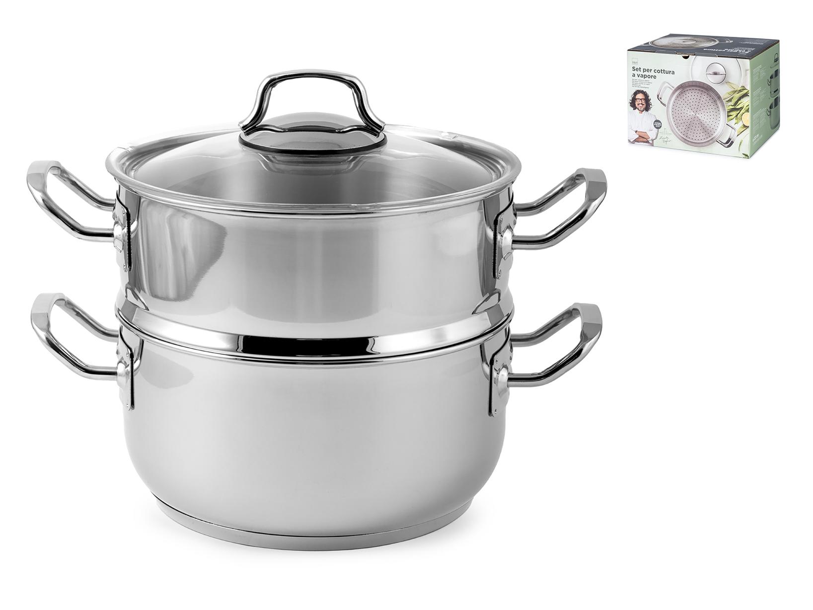 Set per cottura a vapore in acciaio Inox 18/10 triplo fondo con diametro di 22 cm. Set composto da 1 coperchio in vetro borosilicato, 1 cestello in acciaio inox 18/10 ed una casseruola due manici in acciaio Inox. H&H in collaborazione con Alessandro Borghese - il lusso della semplicità. All'interno della confezione sono presenti le ricette dello Chef. LINEA BORGHESE COTTURE,BORGHESE COTTURE,H&H,heh