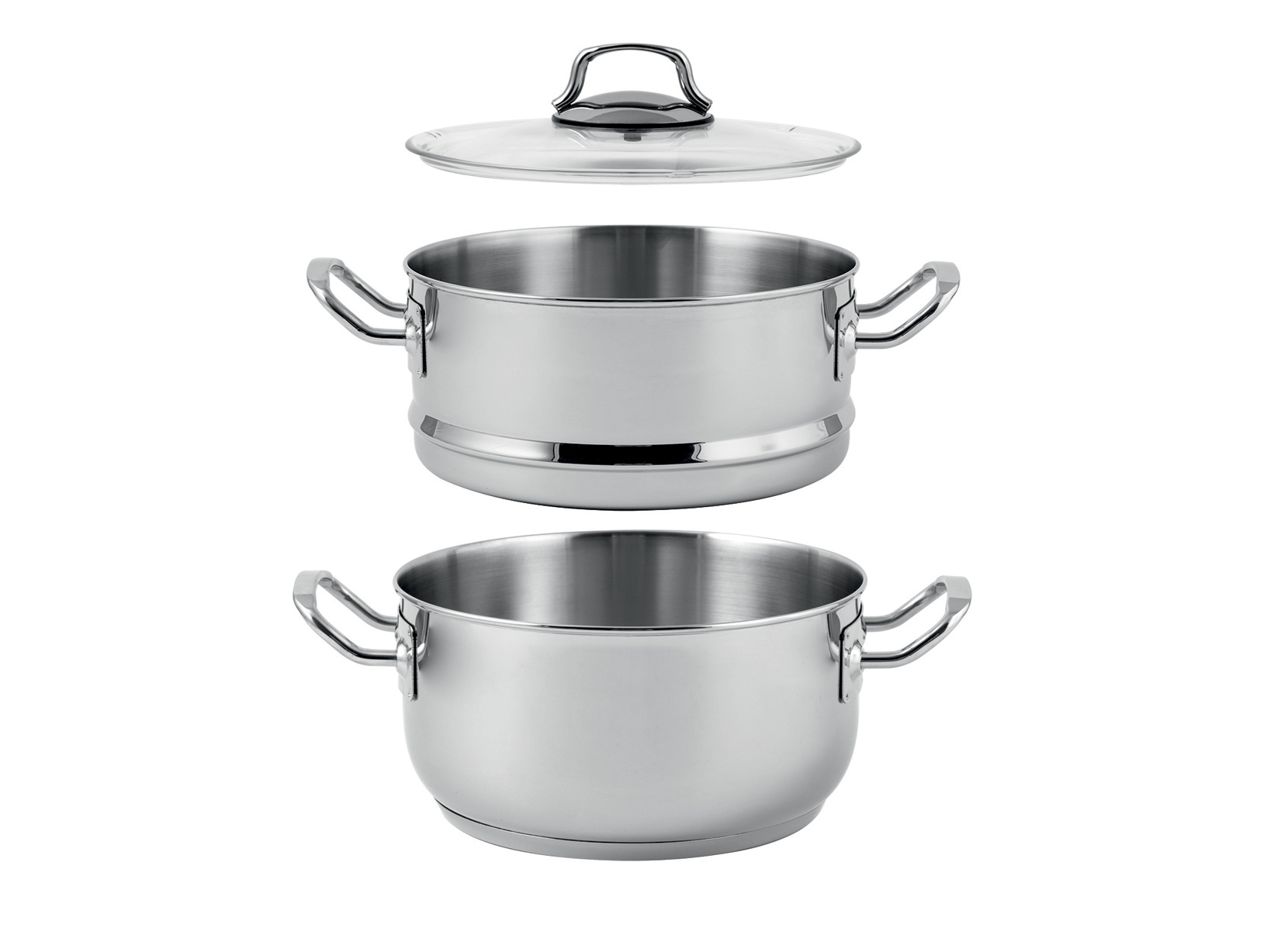 Set per cottura a vapore in acciaio Inox 18/10 triplo fondo con diametro di 22 cm. Set composto da 1 coperchio in vetro borosilicato, 1 cestello in acciaio inox 18/10 ed una casseruola due manici in acciaio Inox. H&H in collaborazione con Alessandro Borghese - il lusso della semplicità. All'interno della confezione sono presenti le ricette dello Chef. LINEA BORGHESE COTTURE,SCONTO20,H&H,heh