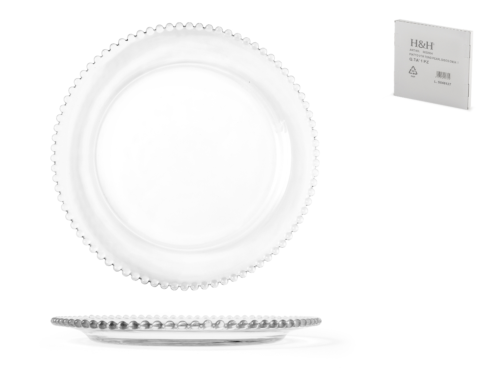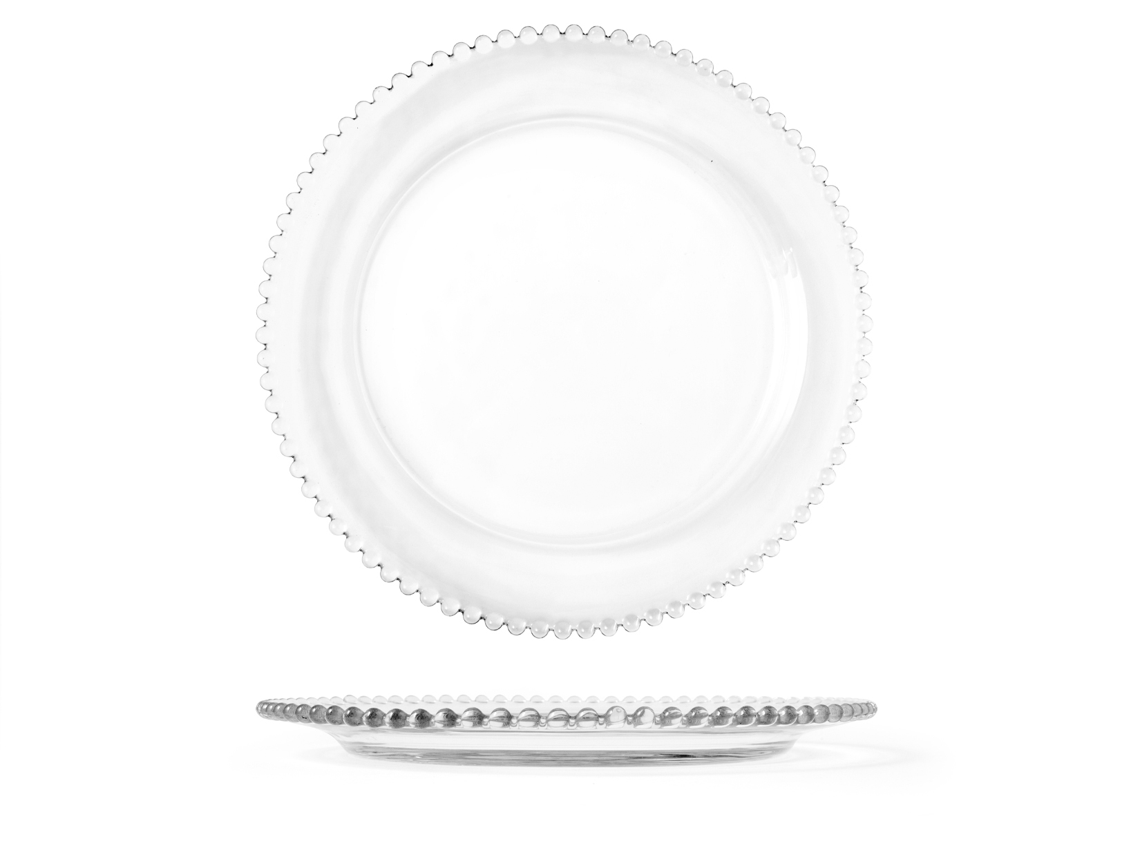 Set composto da 6 piatti tondi Collier realizzati in vetro trasparente con ala perlinata cm 34. Ideale per servire portate principali, piatti unici o grandi insalate. Idonei al lavaggio in lavastoviglie. LINEA COLLIER VTR,COLLIER VTR,Natale,tavola-di-Natale,H&H,heh